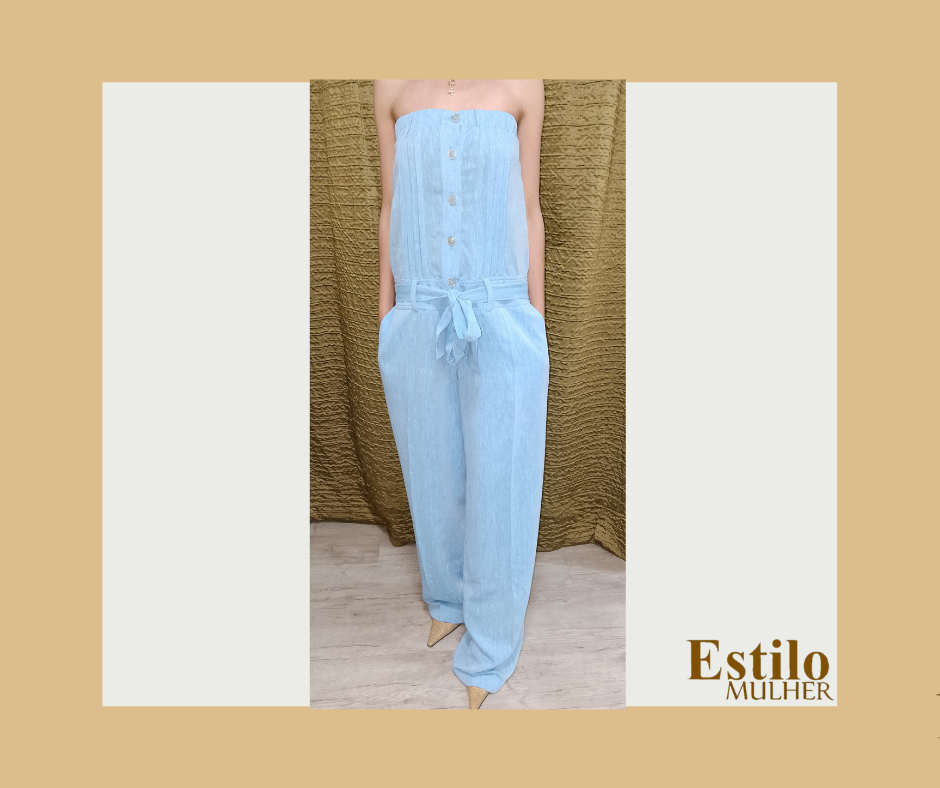 Macacão tomara que caia com cinto removível, fechamento em botões frontais com bolsos faca.